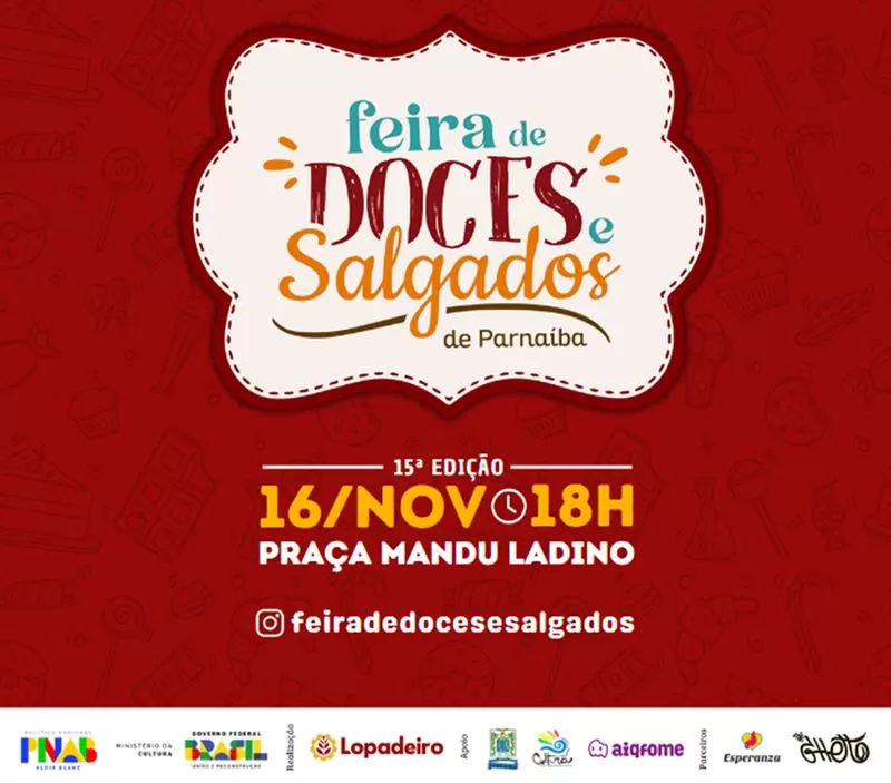 A Feira de Doces e Salgados é realizada desde 2015 e, em sua 15ª edição, conta com recursos da Política Nacional Aldir Blanc de Fomento à Cultura (PNAB) obtidos via edital de seleção da Prefeitura Municipal de Parnaíba e, além da tradicional experiência gastronômica de qualidade, a edição deste ano traz ações formativas, música com Teófilo Lima, artesanato, parcerias com ONGs e mais!