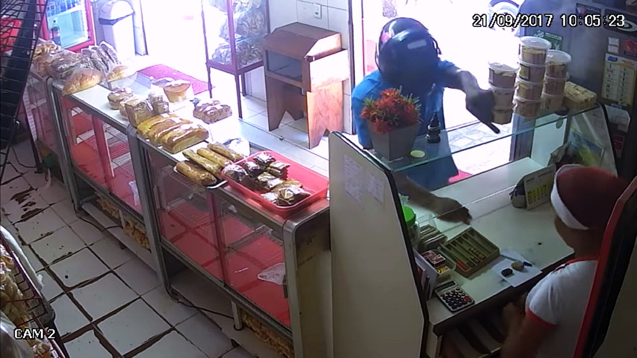 Câmeras de segurança instaladas em uma padaria, flagraram o exato momento em que dois criminosos abordaram a caixa do estabelecimento e levaram todo o dinheiro apurado no turno da manhã. Toda a ação durou menos de 2 minutos.