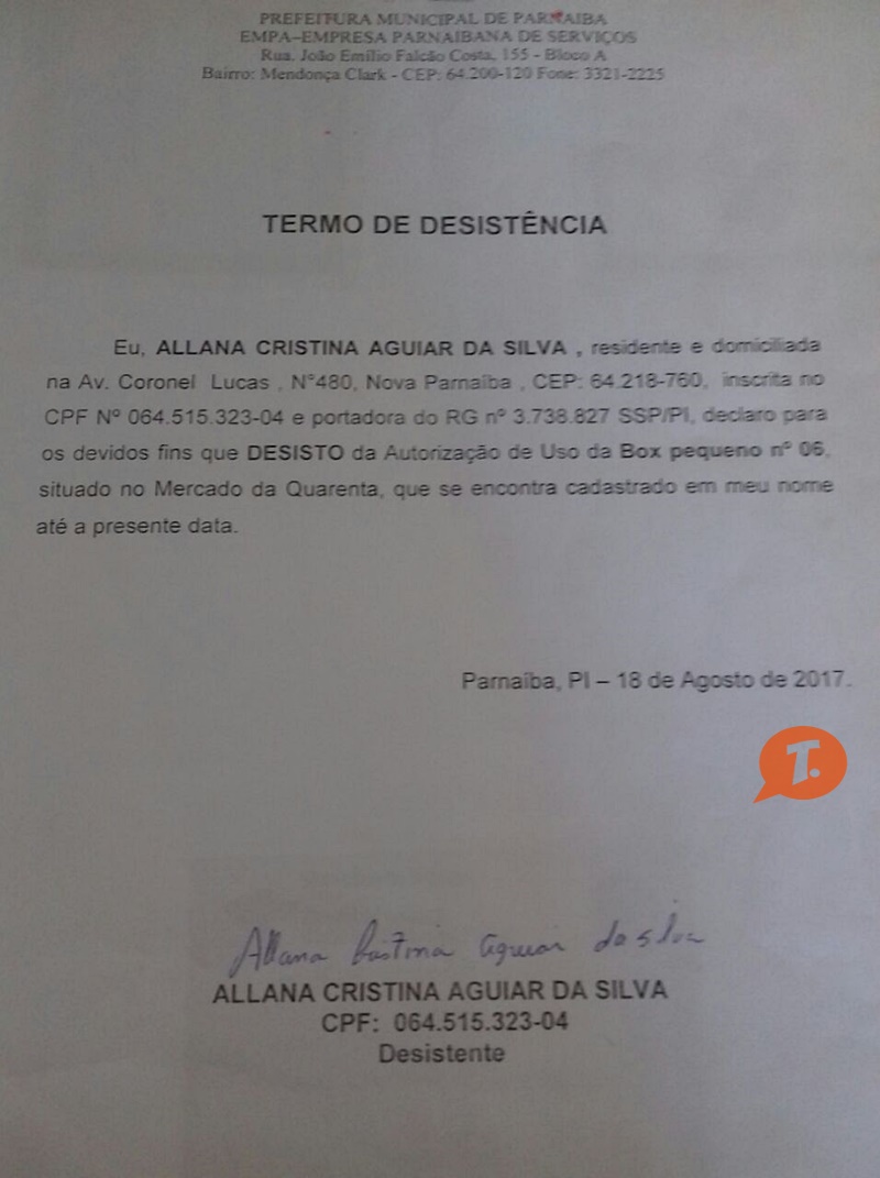 Termo de desistência do Box nº 06, assinado pela Sra. Allana Cristina Aguiar da Silva