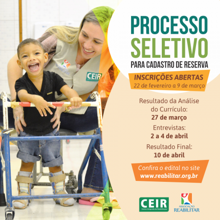 Associação Reabilitar, entidade social que administra o Centro Integrado de Reabilitação (CEIR), em Teresina, divulgou edital de processo seletivo para cadastro de reserva da instituição. O processo seletivo será dividido em duas etapas: avaliação de currículo e entrevistas. O período das inscrições e entrega de currículos será do dia 22 de fevereiro a 9 de março.