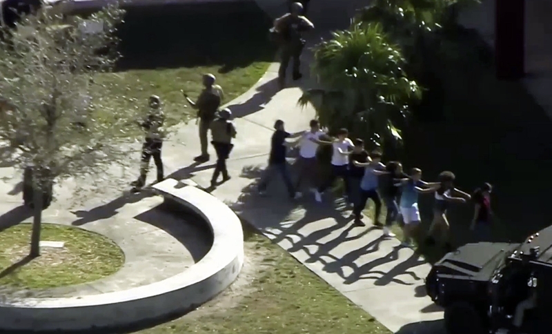 Alunos saem do prédio de escola em Parkland em que ocorreu tiroteio nesta quarta-feira (14) (Foto: WPLG-TV via AP)