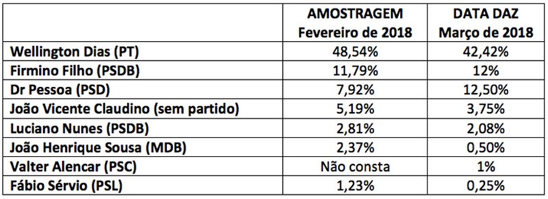 Segundo a pesquisa Data Az, na pergunta estimulada (aquela com os nomes dos pré-candidatos) o governador Wellington Dias (PT) seria reeleito com 42,42% das intenções de votos. Em segundo lugar estaria o deputado estadual Dr Pessoa (PSD) com 2,50% das intenções de votos.