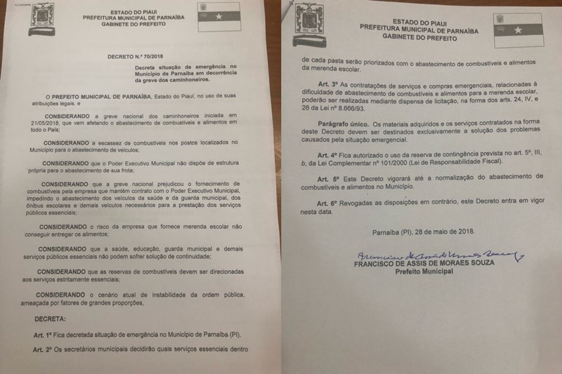 O Prefeito Mão Santa, assinou na manhã desta segunda-feira (28), o documento que decreta situação de emergência no município de Parnaíba, em decorrência da greve dos caminhoneiros.