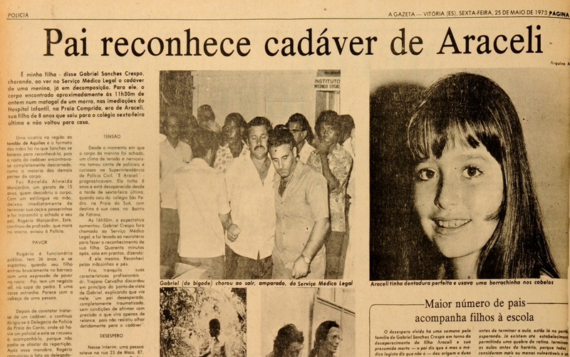 Em 18 de maio de 1973, uma sexta-feira, a menina Araceli de apenas 8 anos de idade saiu de casa, no bairro de Fátima, na Serra, e seguiu para a Escola São Pedro, na Praia do Suá, em Vitória.