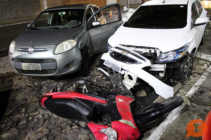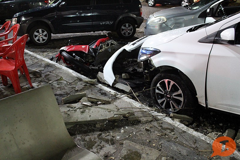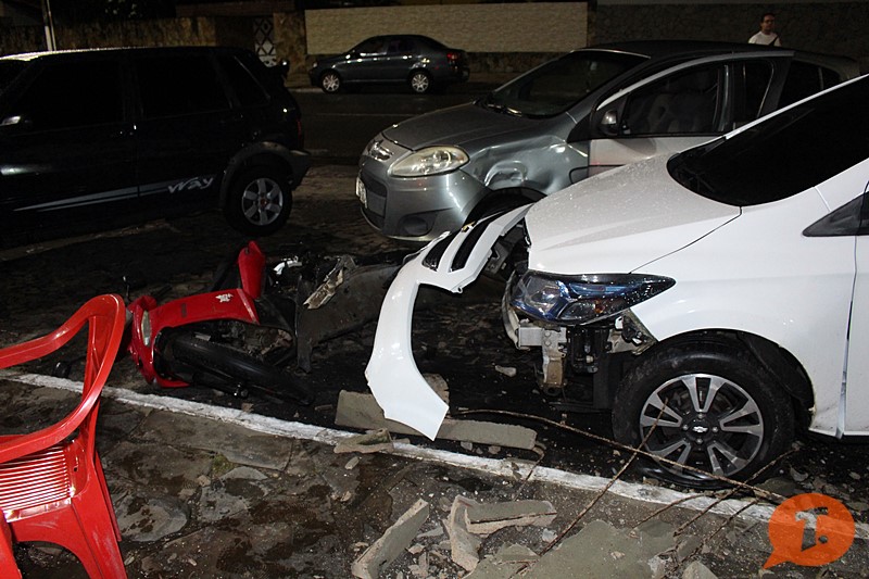 O veículo só parou após quebrar um banco de concreto e colidir contra outros dois veículos que estavam estacionados em frente a uma pizzaria. Apesar da violência do impacto não houveram feridos.