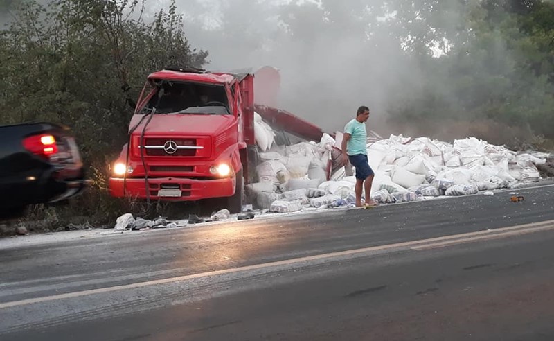 Caminhão carregado de açúcar tombou por volta da 06h20 da manhã desta terça-feira no km 299 da BR-343, entre Altos e Campo Maior.
