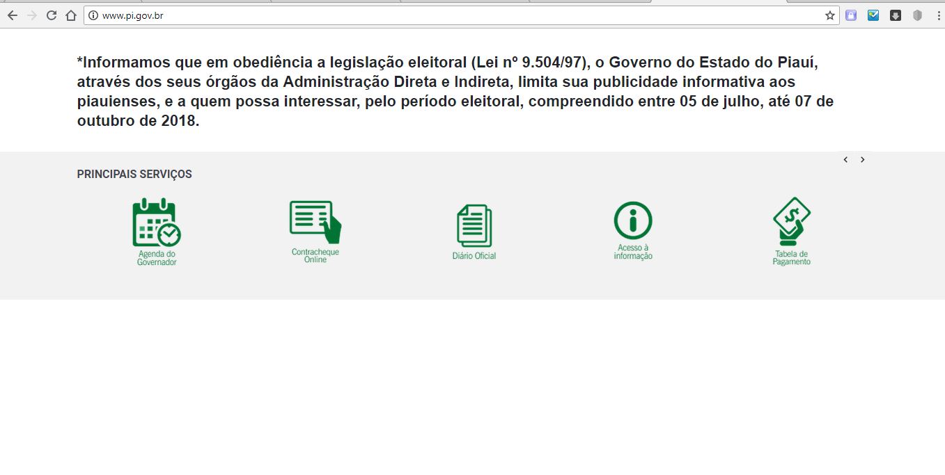 Informamos que em obediência a legislação eleitoral (Lei nº 9.504/97), o Governo do Estado do Piauí, através dos seus órgãos da Administração Direta e Indireta, limita sua publicidade informativa aos piauienses, e a quem possa interessar, pelo período eleitoral, compreendido entre 05 de julho, até 07 de outubro de 2018.