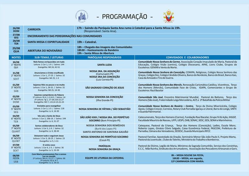 As novenas seguem até a próxima sexta-feira (07) e, encerrando a festa da Padroeira de Parnaíba, no dia 08 de setembro após a santa missa que terá início às 16h30, haverá a tradicional procissão pelas ruas e avenidas da cidade.