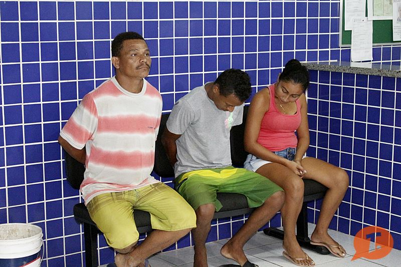 Foram presos: Francisco Jair de Sousa Silva, vulgo Neguinho (blusa cinza), sua esposa, Camila Machado dos Santos e Francisco Fernando Santos Souza, vulgo Gato (blusa listrada). Todos foram trazidos para a Central de Flagrantes em Parnaíba.