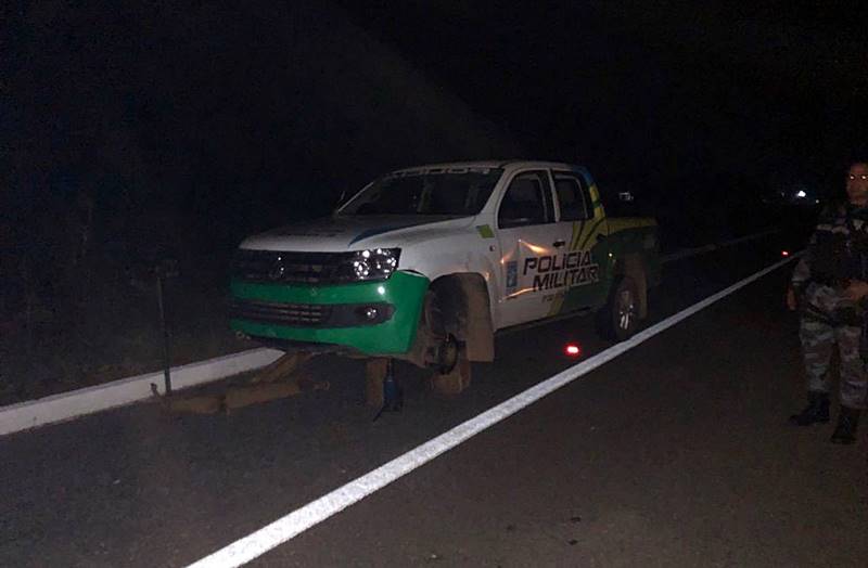 As viaturas tiveram os pneus furados, após os suspeitos atirarem ‘miguelitos’ na estrada para impedir a perseguição policial.