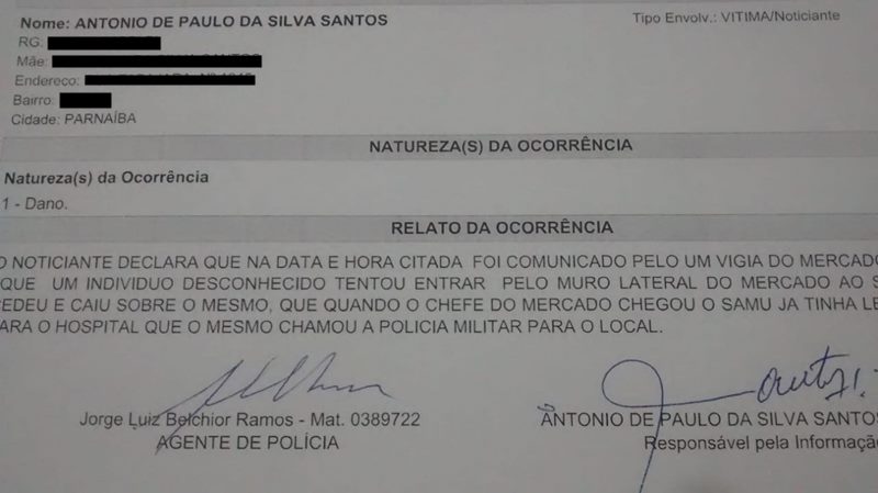Trecho do Boletim de Ocorrência registrado logo após o incidente