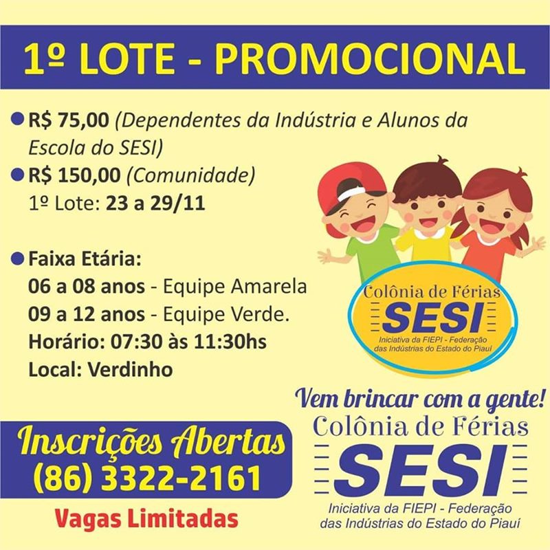No período de férias escolares, o Serviço Social da Indústria (SESI/PI) está preparando mais uma edição da Colônia de Férias destinada ao público infantil de Parnaíba. As atividades serão realizadas no Centro Esportivo Dirceu Arcoverde (Complexo Verdinho), no período de 04 a 14 de dezembro, das 07h30 às 11h30 horas.