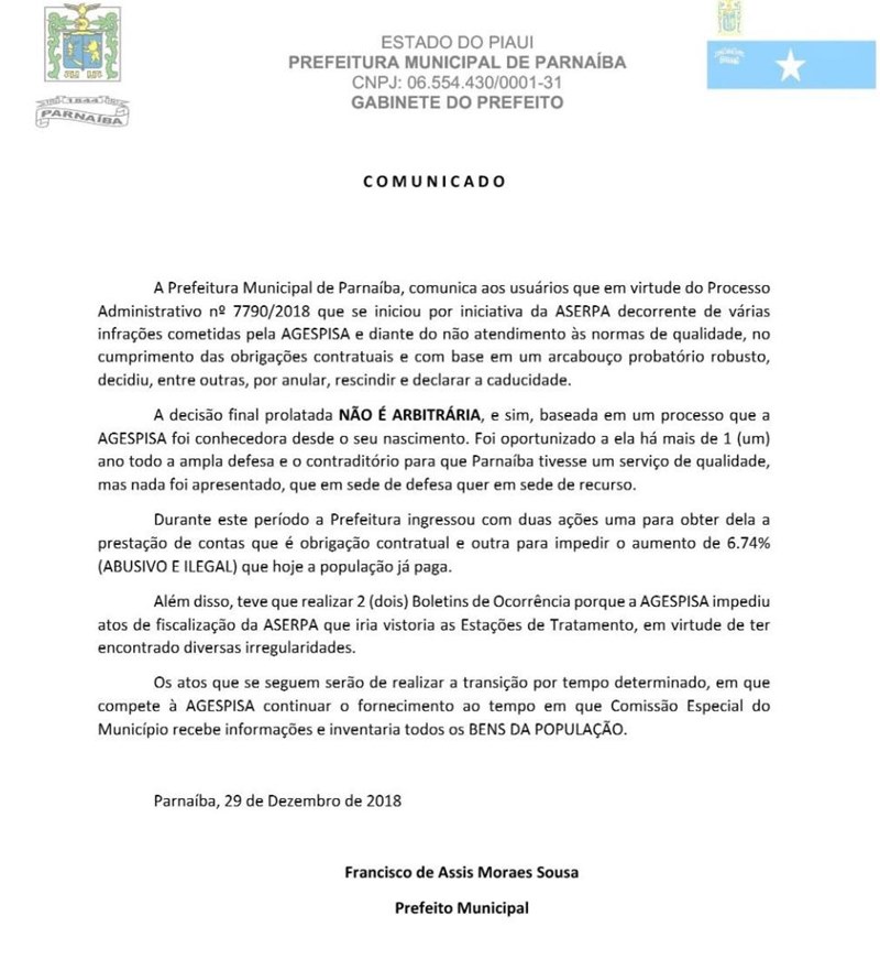A transição dos serviços entre a AGESPISA e a Prefeitura de Parnaíba deve durar 30 dias, nesse período a empresa ainda continua prestando serviços a população parnaibana. CONTINUA APÓS A PUBLICIDADE.