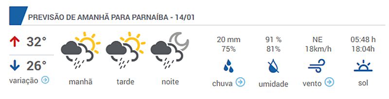 A máxima será de até 32° e a mínima de 26°, com 75% de chances de chuva de até 20mm. A umidade será entre 81 a 91%.