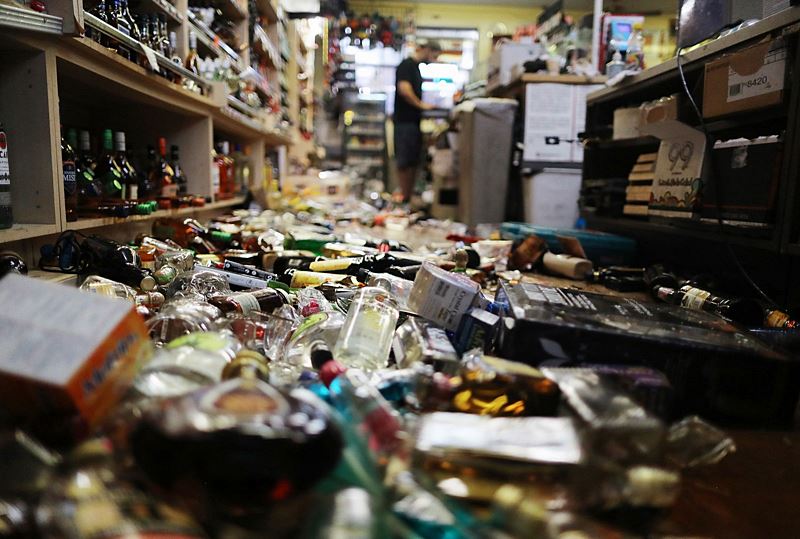 Garrafas quebradas ficaram espalhadas pelo chão após um terremoto de magnitude 7,1 que atingiu Ridgecrest, na Califórnia, nos EUA — Foto: Mario Tama / Getty Images / AFP