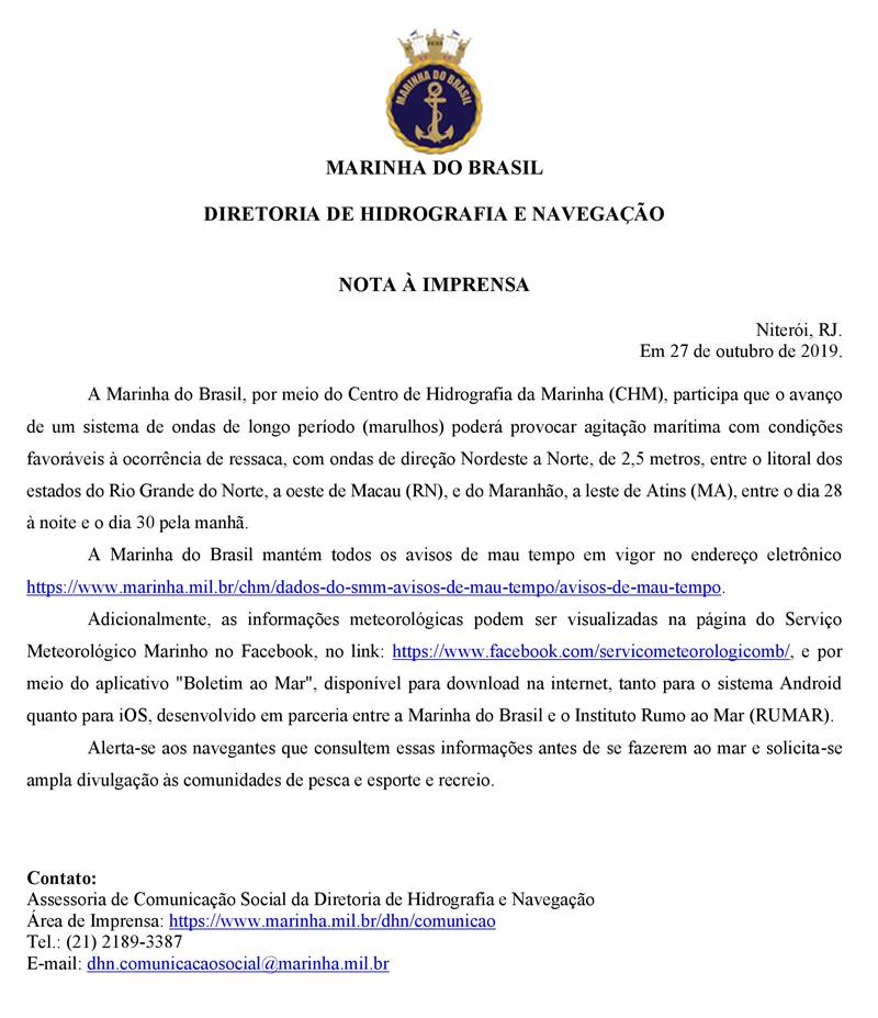A nota finaliza pedindo que os navegantes consultem as informações antes de seguir ao mar, seja para pesca, esporte ou recreio. Confira: