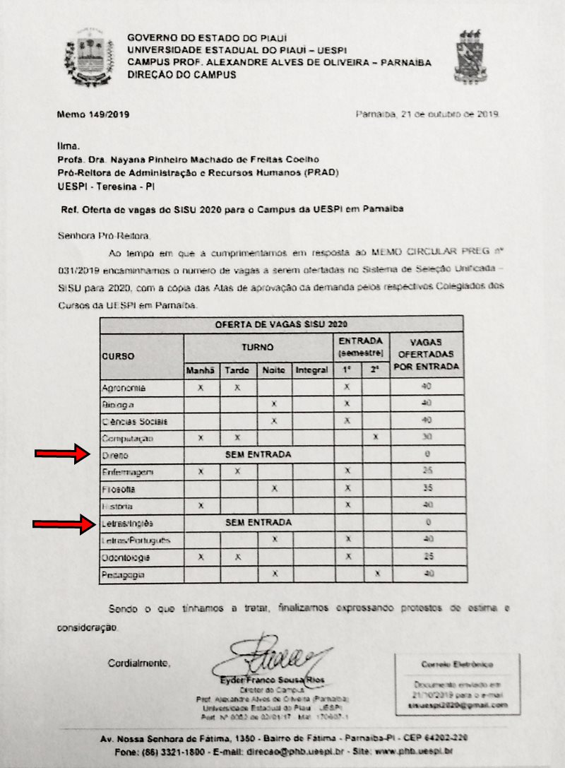 O Memorando com as vagas ofertadas para o SISU 2020, foi enviado à Pró-Reitora de Administração e Recusos Humandos da UESPI, a Professora Doutora Nayana Pinheiro Machado, foi enviado no dia 21 de outubro pelo diretor do Campus Parnaíba, Eyder Franco.