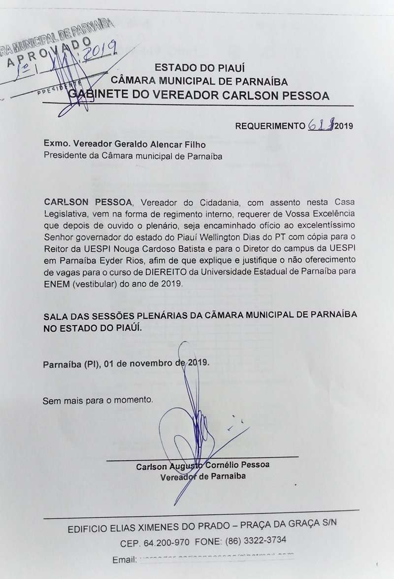 Carlson Pessoa requereu que a Câmara de Parnaíba encaminhe ofício ao Governador Wellington Dias, ao Reitor da UESPI, Nouga Cardoso Batista e ao Diretor do Campus em Parnaíba, Eyder Rios para que os mesmos expliquem e justifiquem o não oferecimento de vagas para os cursos de Direito e Letras inglês, para o ENEM de 2019. Dos 13 vereadores presentes, apenas a vereadora Fátima Carmino (PT) se recusou a assinar o pedido de explicações.