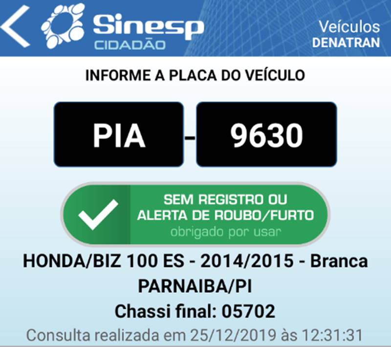 Até às 12h30 desta quarta-feira (25) o sistema de alerta sobre veículos roubados (SINESP Cidadão) ainda não havia atualizado o status do veículo para “roubado” no entanto, a motocicleta ainda pode ser identificada pela numeração final do chassi: 05702.
