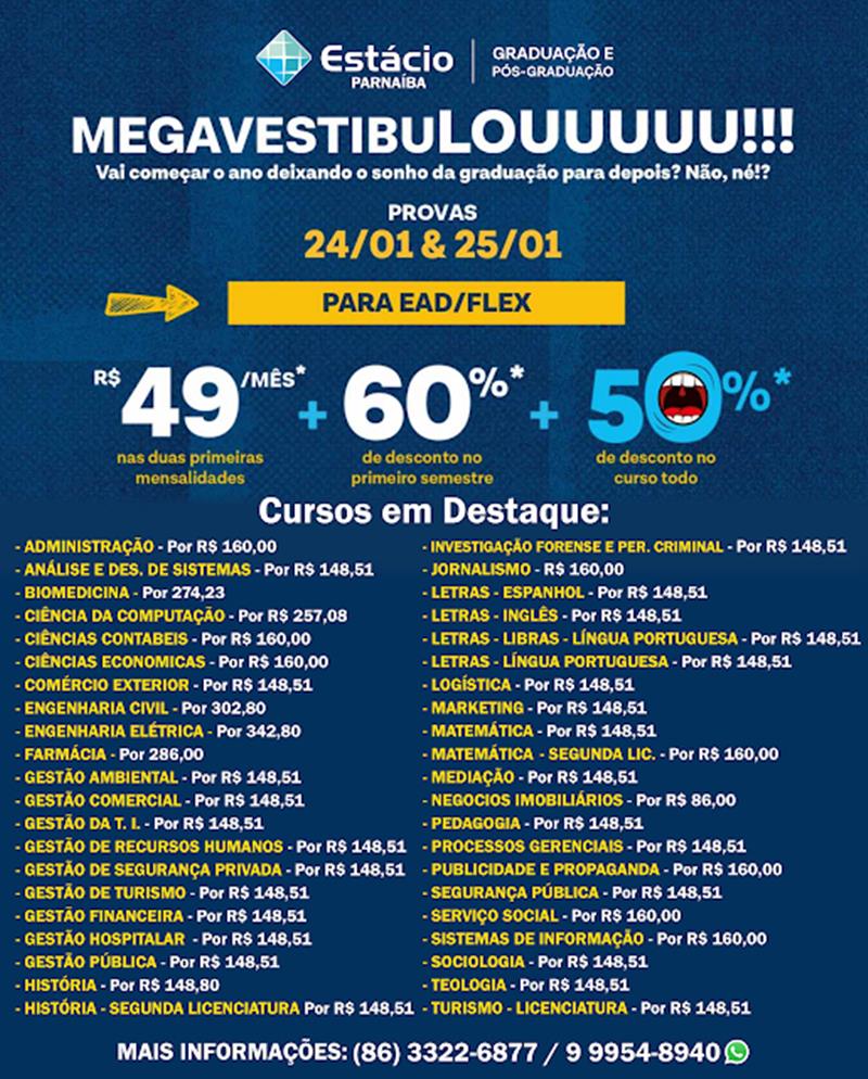 Nos dias 24 e 25 de janeiro (sexta e sábado) ocorrerá o MegaVestibular, onde será oferecido 60% de desconto no primeiro semestre + 50% até o final do curso.