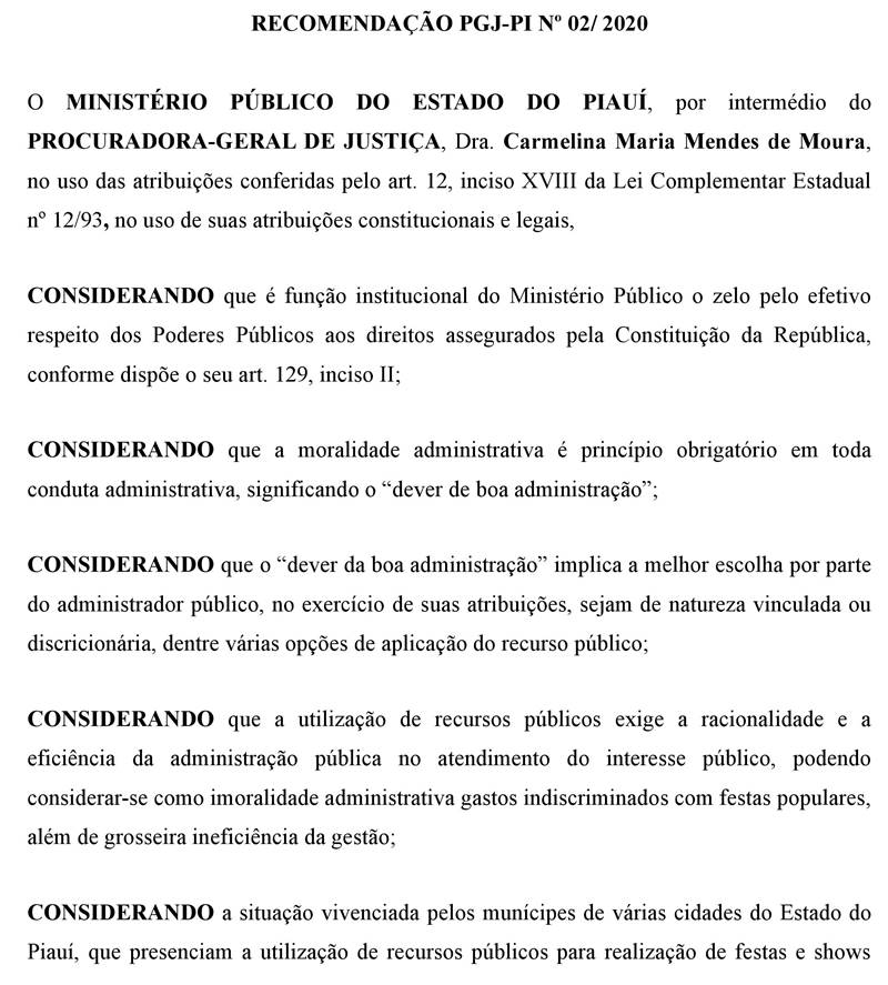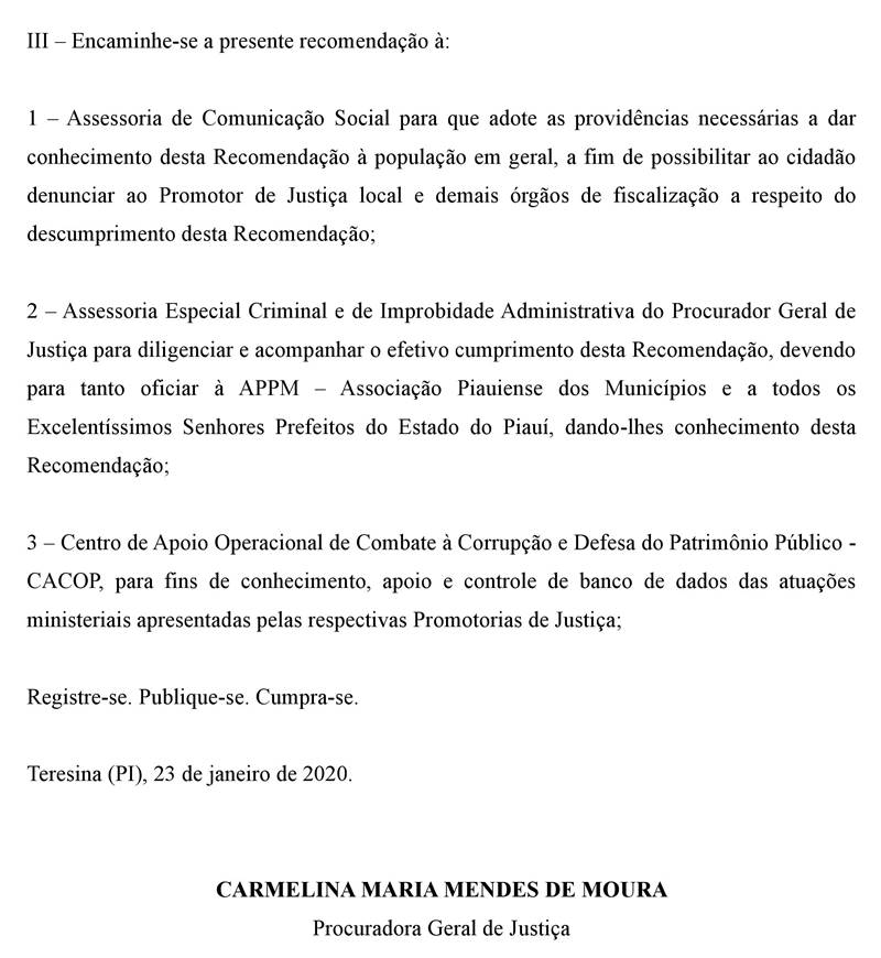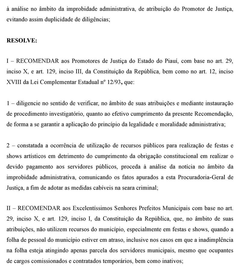 A PGJ propõe aos membros do MPPI, a instauração de procedimentos investigatórios para verificar se os gestores municipais estão cumprindo a recomendação. Caso seja constatado que o gestor promoveu festas ou shows artísticos estando com salários dos servidores atrasados, o fato deverá ser comunicado à Procuradoria-Geral de Justiça, a fim de que sejam adotadas as medidas cabíveis. Confira a recomendação na íntegra:
