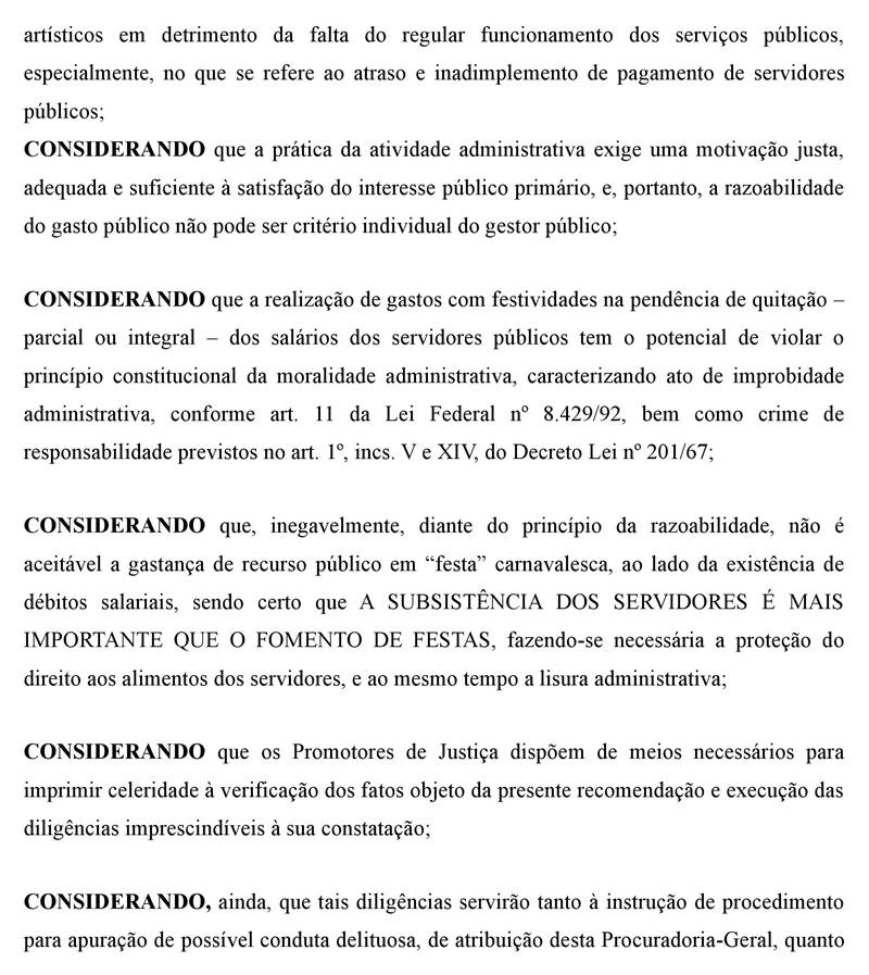 A Recomendação se fundamenta na aplicação eficiente e razoável dos recursos públicos, com o intuito de evitar que os gestores municipais promovam festas e shows, inclusive, durante o carnaval, caso a administração pública esteja em atraso de salário com os servidores municipais, ainda que sejam somente ocupantes de cargos comissionados e contratados temporários, bem como inativos.