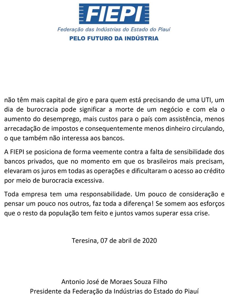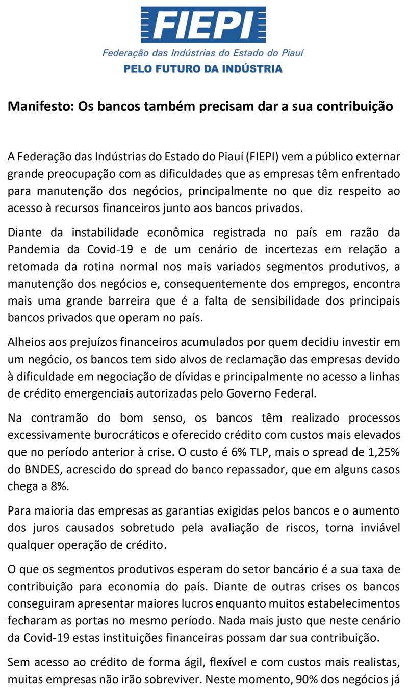 A Federação das Indústrias do Estado do Piauí, emitiu nesta terça-feira (07) um manifesto onde se posiciona de forma veemente contra a falta de sensibilidade dos bancos privados, que elevaram os juros em todas as operações e dificultaram o acesso ao crédito por meio de burocracia excessiva.