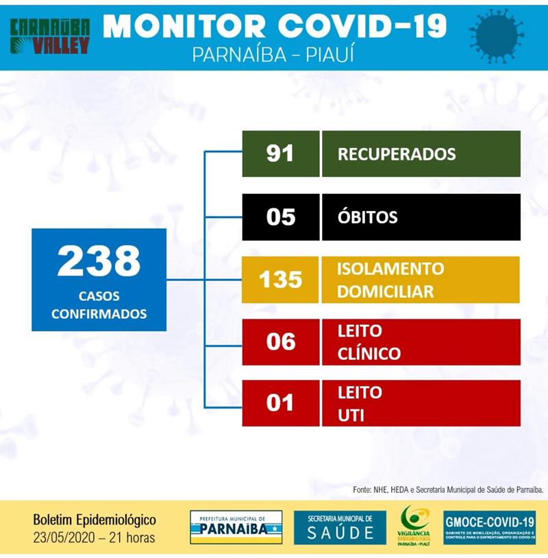 O Monitor Covid-19, da Prefeitura de Parnaíba, divulgado neste sábado (23), mostra que subiu de 226 para 238 o número de casos positivos para COVID-19 em Parnaíba, desde o primeiro caso registrado, em março deste ano.