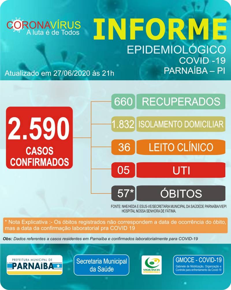 O informe epidemiológico da Prefeitura de Parnaíba, divulgou na noite deste sábado (27), os números do avanço nos casos de coronavírus no município de Parnaíba.