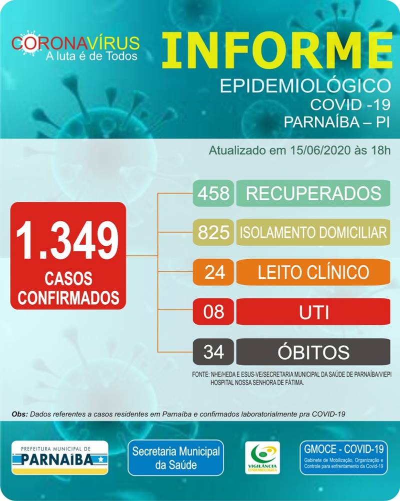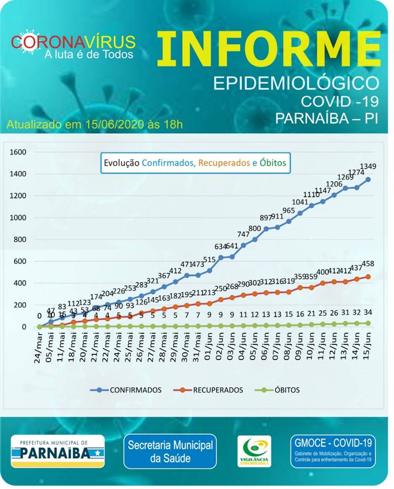 21 casos de pacientes clinicamente recuperados também foi registrado no Informa Epidemiológico da Prefeitura de Parnaíba desta segunda-feira, Parnaíba possui agora 458 pacientes recuperados. Confira o Informe Epidemiológico desta segunda-feira, 15 de junho de 2020: