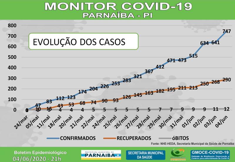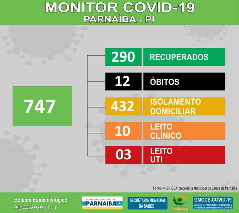 Foi registrado mais um óbito. Agora são 747 casos e 12 óbitos. Número de recuperados também subiu para 290, tornando Parnaíba a cidade que mais recupera pacientes de COVID-19 no Piauí.