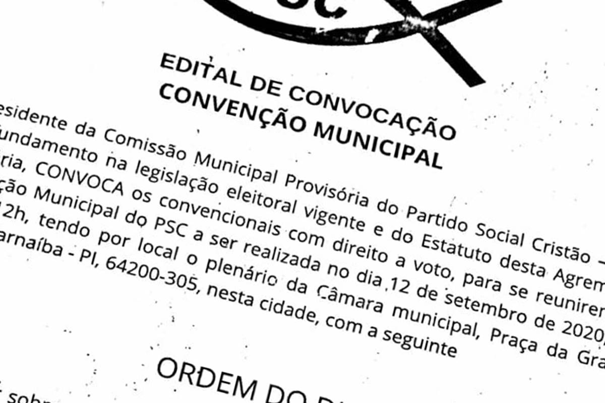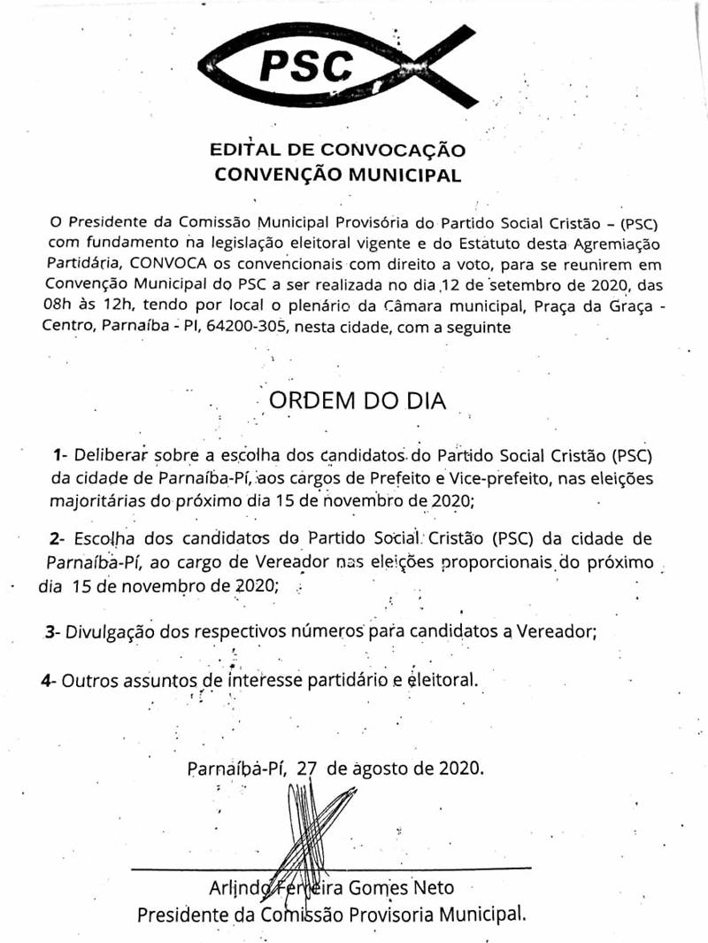 Eleições 2020Zero PSC divulga edital de convocação para convenção municipal por Tribuna de Parnaíba 28 de agosto de 2020 escrito por Tribuna de Parnaíba 28 de agosto de 2020 44 Convenção ocorrerá no dia 12 de setembro, das 08h às 12h na Câmara Municipal de Parnaíba. O Partido Social Cristão – PSC, emitiu nesta quinta-feira, 27 de agosto, o edital de convocação para a convenção municipal do partido. Confira abaixo: 0 comentários 0 FacebookTwitterPinterestEmail Tribuna de Parnaíba postagem anterior STJ determina afastamento do governador do Rio de Janeiro próxima postagem Horário de votação é antecipado em 1 hora, das 7h às 17h Postagens relacionadas Piauí registra 21 mortos e 765 novos casos... 26 de fevereiro de 2021 PP de Ciro Nogueira investe forte em Gracinha... 19 de fevereiro de 2021 SEDESC de Parnaíba anuncia 4º edital de convocação... 19 de fevereiro de 2021 Governo do Piauí prorroga decreto e altera medidas... 19 de fevereiro de 2021 Hospital Dirceu Arcoverde em Parnaíba, suspende visitas a... 19 de fevereiro de 2021 Jornalista Carlos Mesquita deixa UTI do Hospital Universitário... 18 de fevereiro de 2021 Prefeitura de Parnaíba esclarece sobre compra de livros... 18 de fevereiro de 2021 Sem aulas presenciais Wellington Dias abre crédito de... 18 de fevereiro de 2021 Parnaíba registrou mais 04 mortes por COVID-19 nesta... 18 de fevereiro de 2021 Mão Santa terá audiência sobre obra de piscinão... 17 de fevereiro de 2021 Deixe um comentário Cancelar resposta Salvar meu nome, e-mail, e site neste navegador, para a próxima vez que eu comentar Δ