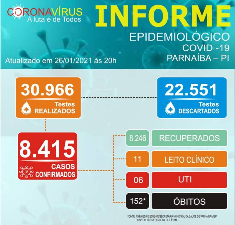 Nas últimas 24 horas foram registrados, no Piauí, 726 casos confirmados e 11 óbitos pela Covid-19, segundo os dados divulgados pela Secretaria de Estado da Saúde, na noite desta terça-feira (26). Parnaíba registrou 40 novos casos e uma morte.