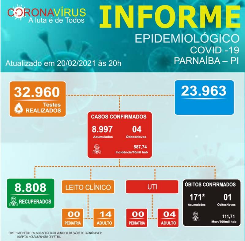 Os casos confirmados no estado somam 169.465 distribuídos em todos os municípios piauienses. Já os óbitos pelo novo coronavírus chegam a 3.242 e foram registrados em 208 municípios. Até agora, morreram 1.898 homens e 1.344 mulheres. Parnaíba acumula até o momento 171 mortes em decorrência da COVID-19.
