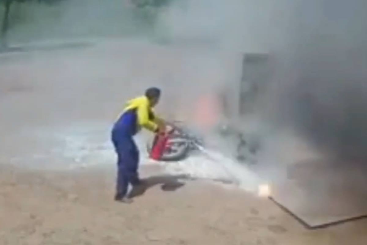 Um frentista enfrentou as chamas para apagar o incêndio que consumia uma moto em um posto de combustíveis na cidade de Granja, distante 145 quilômetros de Parnaíba. As chamas assustaram o motociclista e outras pessoas próximas, que correram do local. Não houve feridos. Continua depois da publicidade