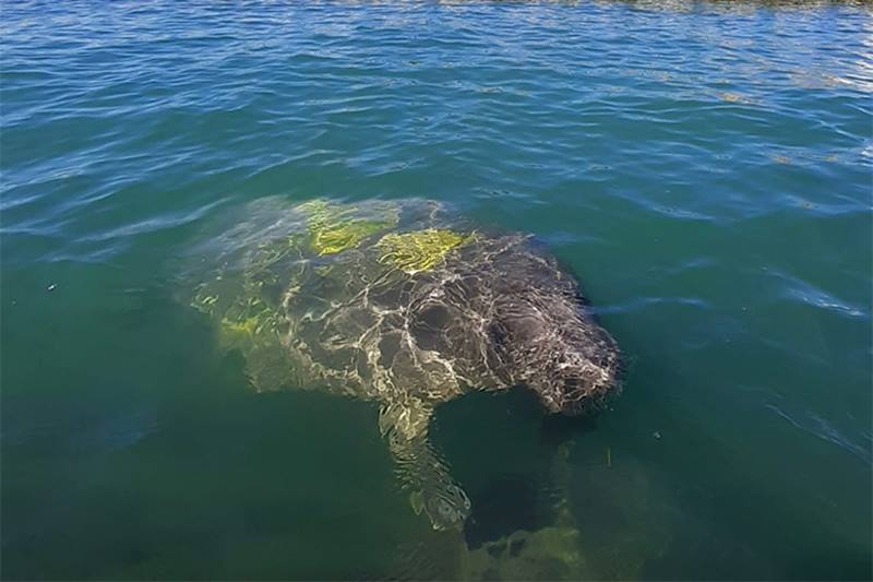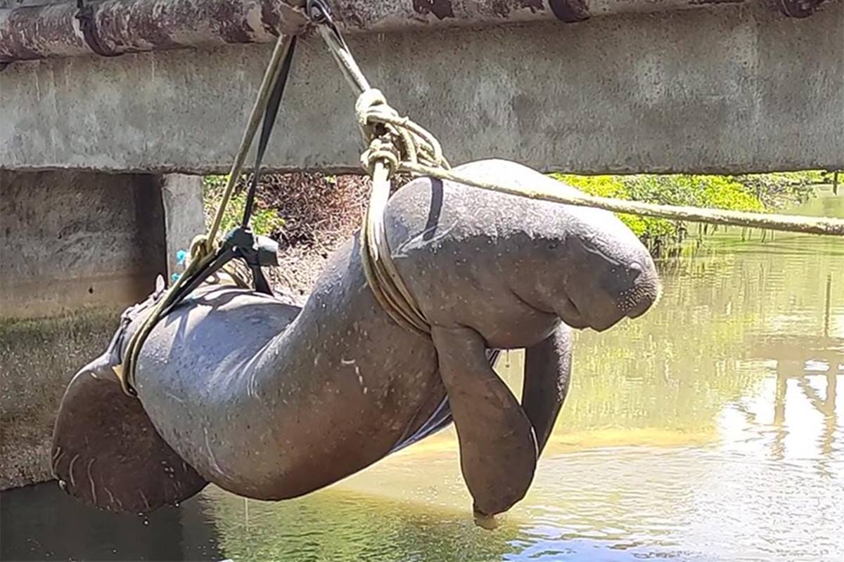 O animal estava morto e tinha um de cinto de borracha no pedúnculo caudal, acessório que integra o equipamento de rastreamento de peixes-boi.