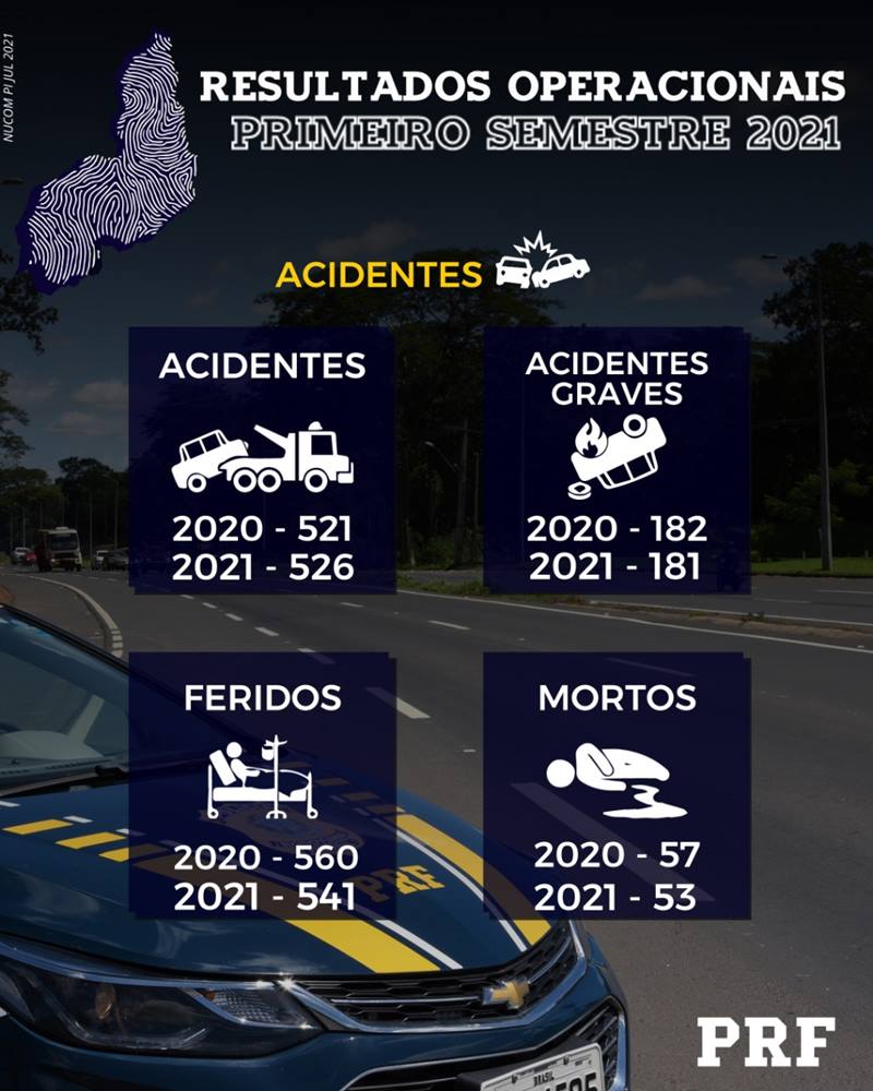 Nos seis primeiros meses, a PRF registrou 526 acidentes, sendo 181 de natureza grave, 541 feridos e 53 mortos nas rodovias federais piauienses. Se comparado ao mesmo período de 2020, a quantidade de acidentes sofreu um leve aumento na ordem de 1,0 %, a quantidade de acidentes considerados graves reduziu em 0,5 %, a quantidade de feridos reduziu em 3,3 % e a quantidade de mortos teve um decréscimo em 7,0 %.