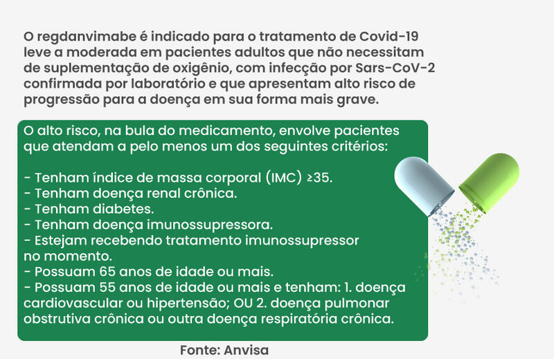 O Regkirona é indicado para o tratamento de quadros de infecção por Covid-19 em situações leves e moderadas, em pacientes adultos, que não necessitam de suplementação de oxigênio e que apresentam alto risco de progressão para a doença em sua forma mais grave. A bula do medicamento traz que há alto risco para pacientes que façam parte de um desses grupos:
