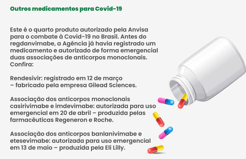- Associação dos anticorpos monoclonais casirivimabe e imdevimabe: autorizada para uso emergencial em 20 de abril