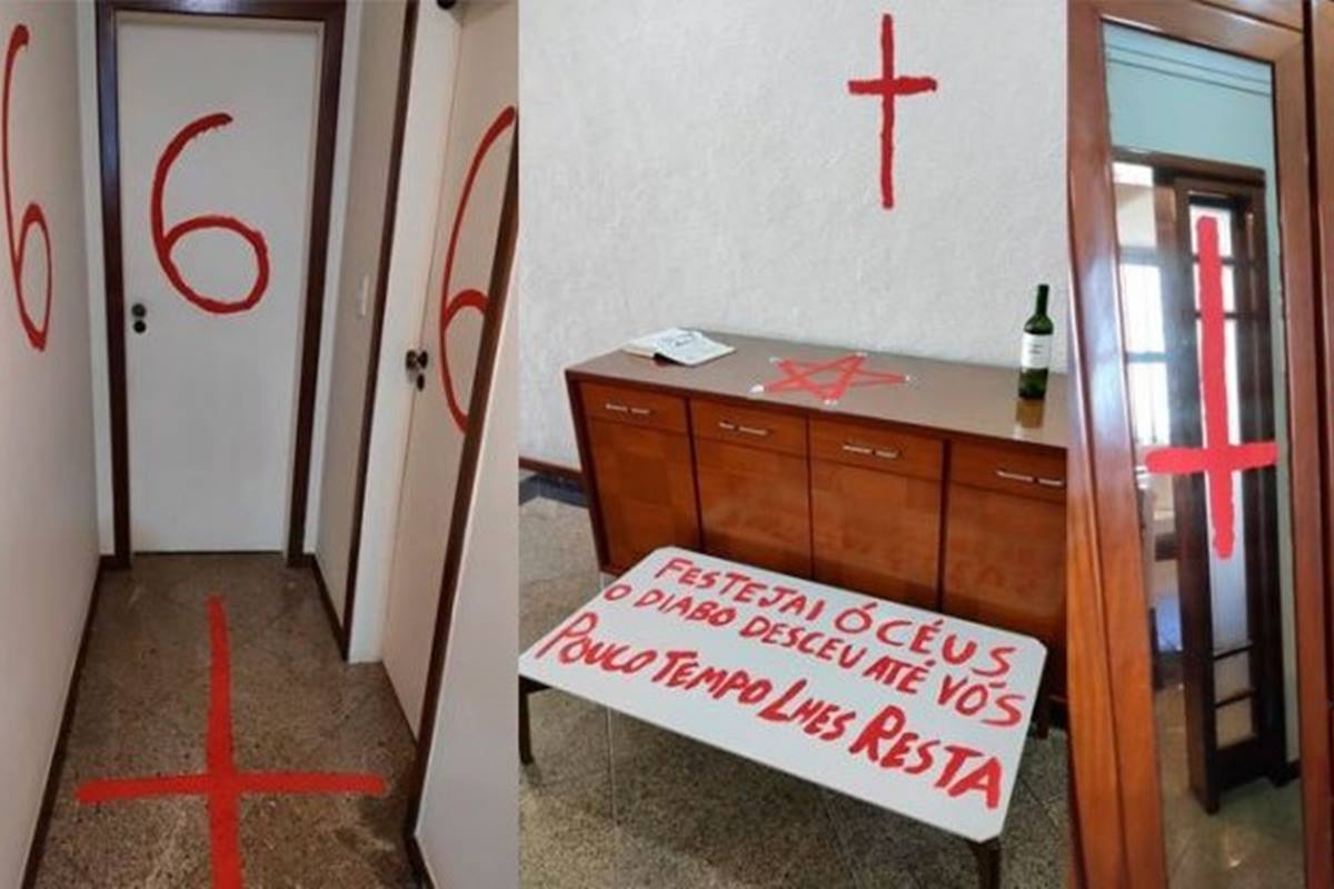 “Festejai ó céus, o diabo desceu até vós, pouco tempo lhes resta”, diz uma delas, próximo a um crucifixo, em uma das paredes da residência. A Polícia Militar confirmou que as imagens foram feitas dentro do apartamento.