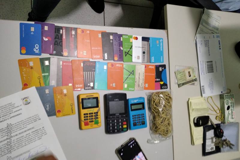 Dois homens que estavam em atitude suspeita foram abordados e com eles encontrada uma grande quantia em dinheiro, além de vários cartões de crédito em nome de diversas pessoas, extratos bancários e maquinetas de cartão. A ação policial foi apoiada por informações da Diretoria de Inteligência da Polícia Militar.