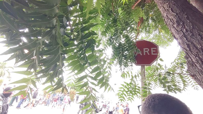 Placa encoberta por galhos e por trás de uma árvore