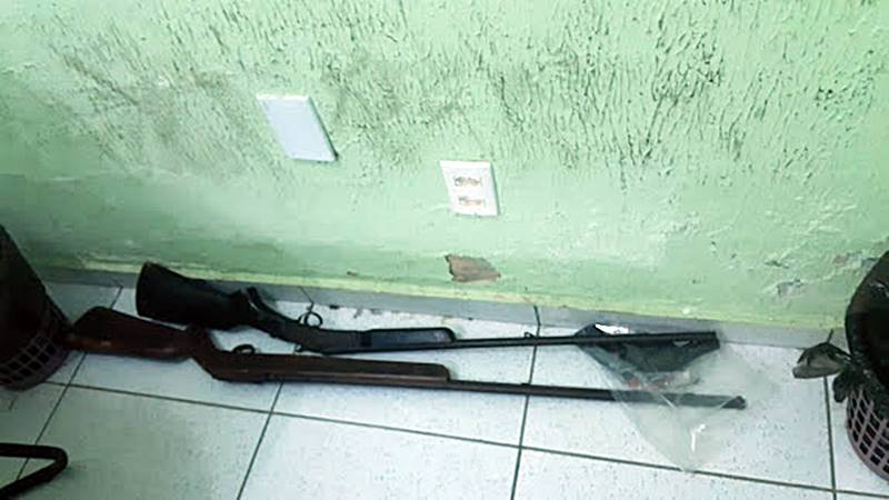 Em uma das residências, a PM apreendeu duas espingardas, sendo uma do calibre 36 com 04 cartuchos intactos e 03 deflagrados, e outra do tipo bate-bucha.