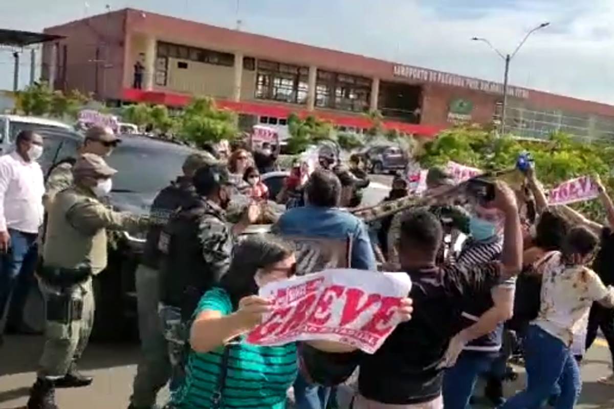Manifestantes aguardavam governador e comitiva em frente ao aeroporto de Parnaíba. Polícia fez cordão de isolamento e proteção.