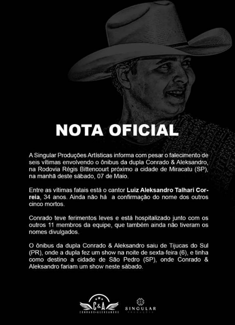 Em nota, a Singular Produções Artísticas informa com pesar o falecimento de seis vítimas envolvendo o ônibus da dupla Conrado & Aleksandro, na rodovia Régis Bittencourt próximo à cidade de Miracatu (SP), na manhã deste sábado (7).