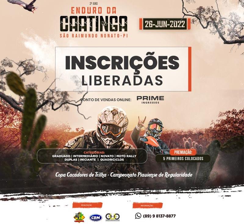 A Federação de Motociclismo do Piauí – FMP, presidida por Zenardo Maia, já homologou e supervisionará a 2ª edição do Enduro da Caatinga, prova que valerá pela 5ª e 6ª etapas do Campeonato Piauiense de Enduro de Regularidade. A prova muda os ares, o tipo de terreno e segue para o sul do Estado, em São Raimundo Nonato, a 523 km de Teresina, diferentemente das quatro primeiras etapas do Estadual que aconteceram na região do centro norte do Estado. Continua depois da publicidade