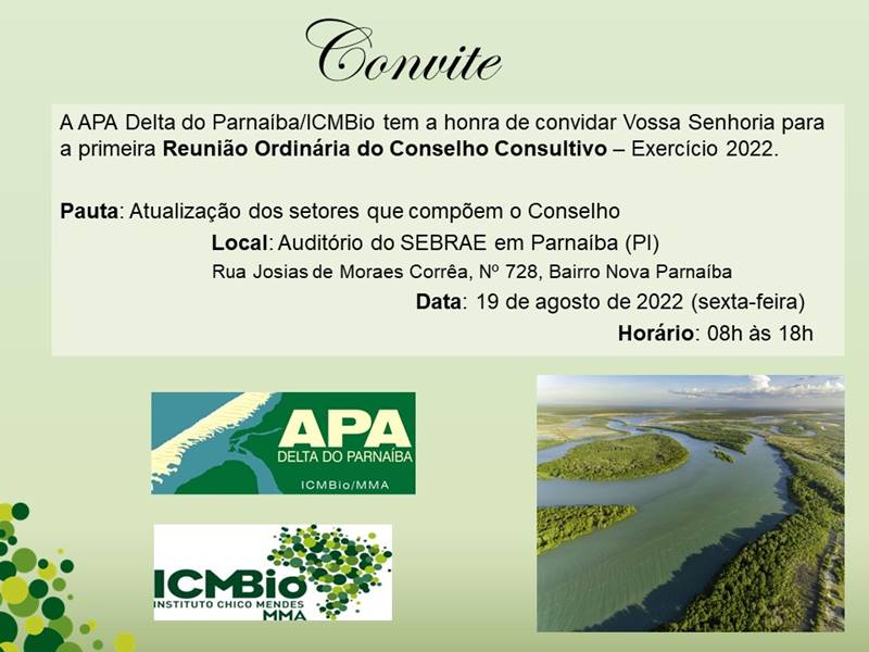 A Área de Proteção Ambiental – APA Delta do Parnaíba/ICMBio convoca os Conselheiros do seu Conselho Consultivo para participarem da Reunião Ordinária que será realizada no dia 19 de agosto de 2022, das 08h às 17h, no Auditório do SEBRAE, em Parnaíba – PI.