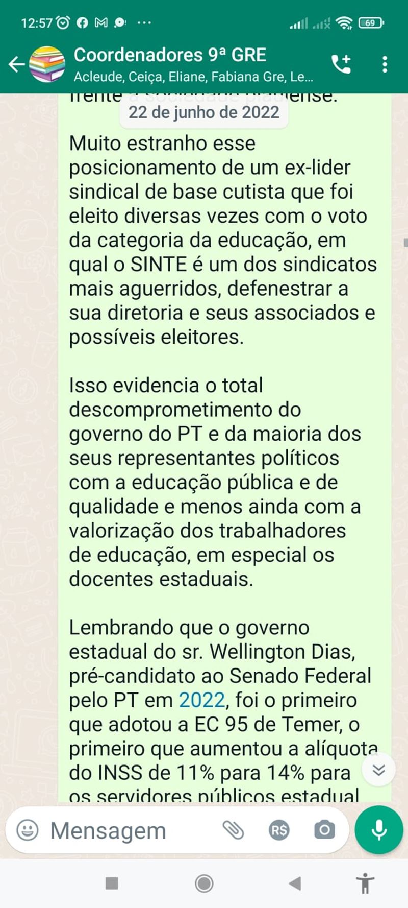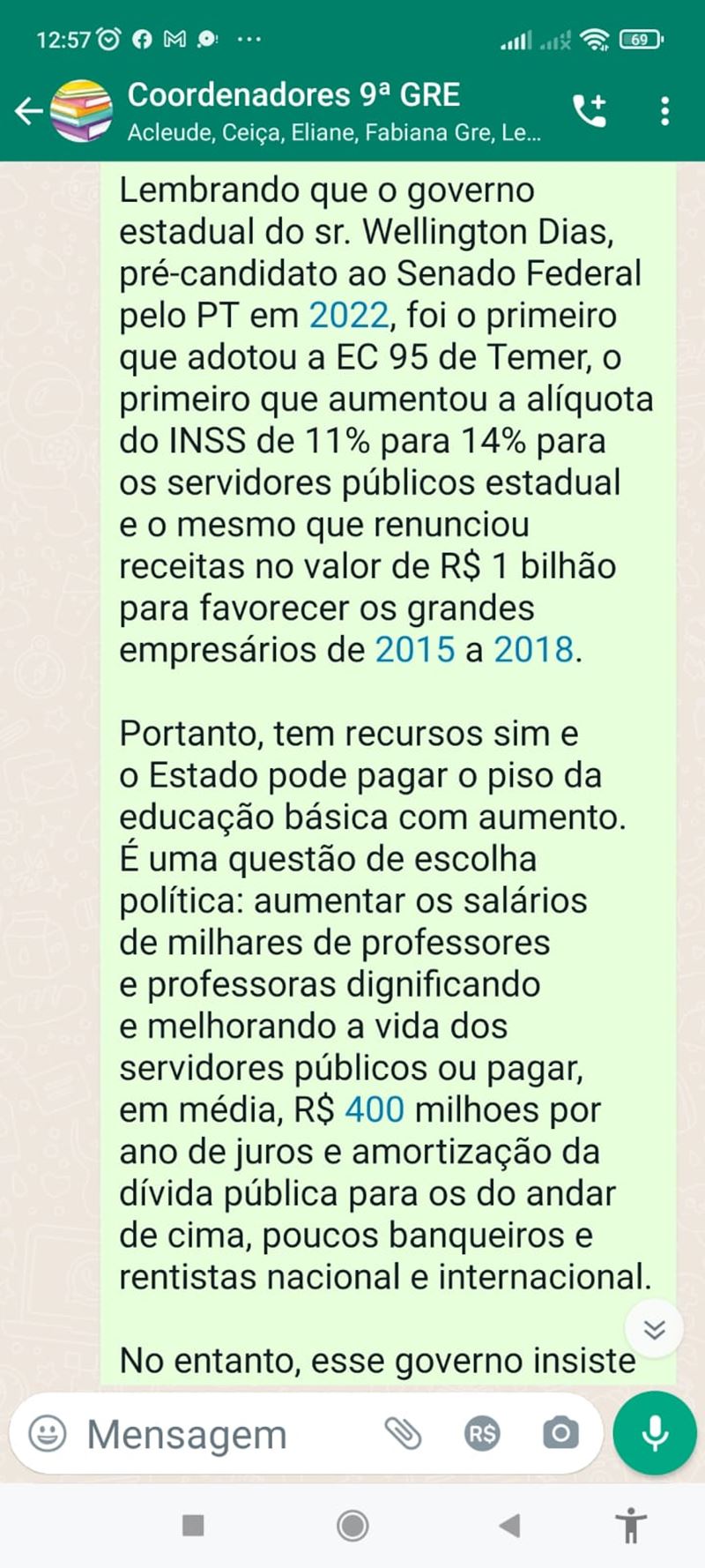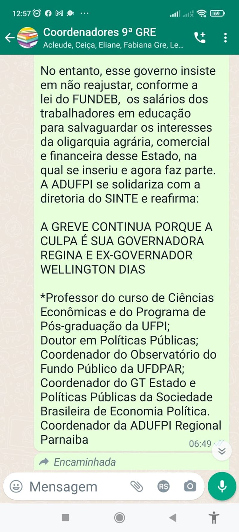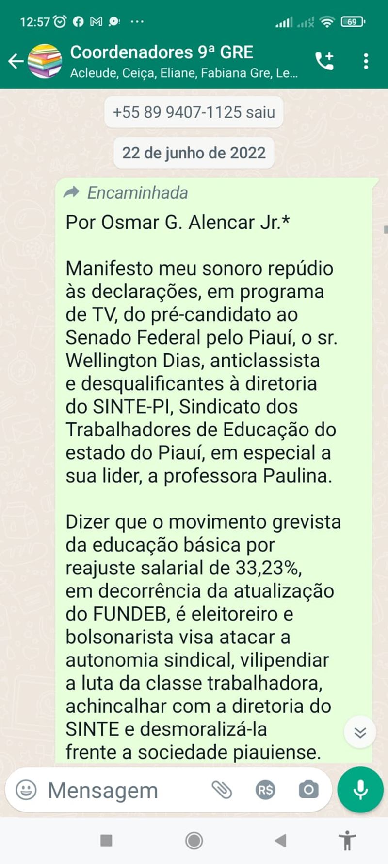 Na mensagem encaminhada, pode-se observar uma nota de repúdio contra a declaração de Wellington Dias, que comparou o movimento grevista da educação básica como algo “eleitoreiro e bolsonarista”. A nota destacou que tal afirmação ataca a autonomia sindical, desmoralizando o SINTE-PI diante da sociedade e, demonstra desprezo pela luta da classe trabalhadora da educação, que já o elegeu diversas vezes. O texto ainda traz medidas que o ex-administrador adotou e que prejudicam a classe docente e a educação pública no estado.