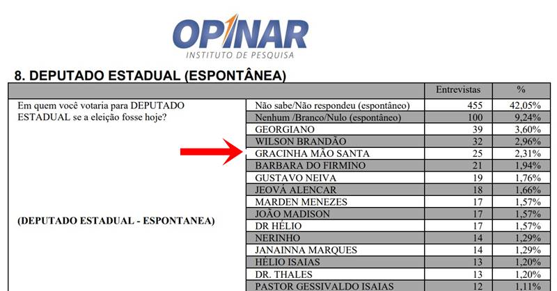 A parnaibana Gracinha Mão Santa, candidata a deputada estadual pelo partido Progressita (PP), aparece em 3º lugar na pesquisa de intenção de votos, do tipo espontânea. Continua depois da publicidade