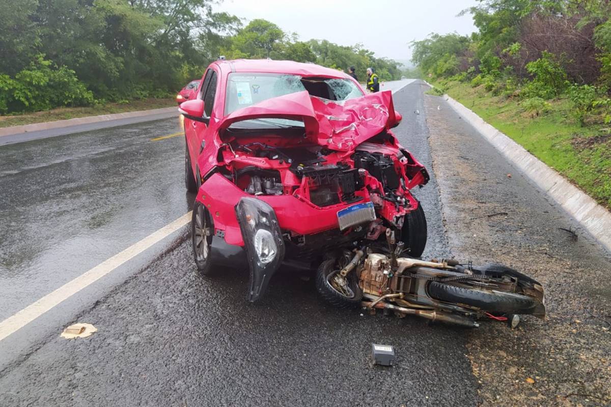 Colisão envolveu um veículo Fiat Strada e uma motocicleta Honda CG Fan. Chovia no momento do acidente.